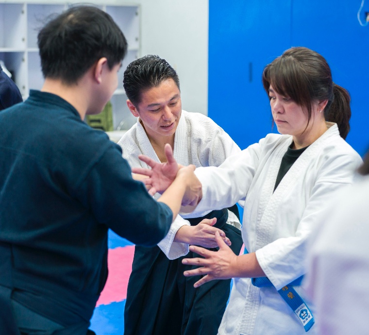 合氣道的特點在於,從與對方接觸的部位開始,透過調整彼此的平衡,不可思議地與對方融為一體,並能輕鬆地引導對方。因為只是調整平衡,所以不分年齡或性別,任何人都能修習合氣道。